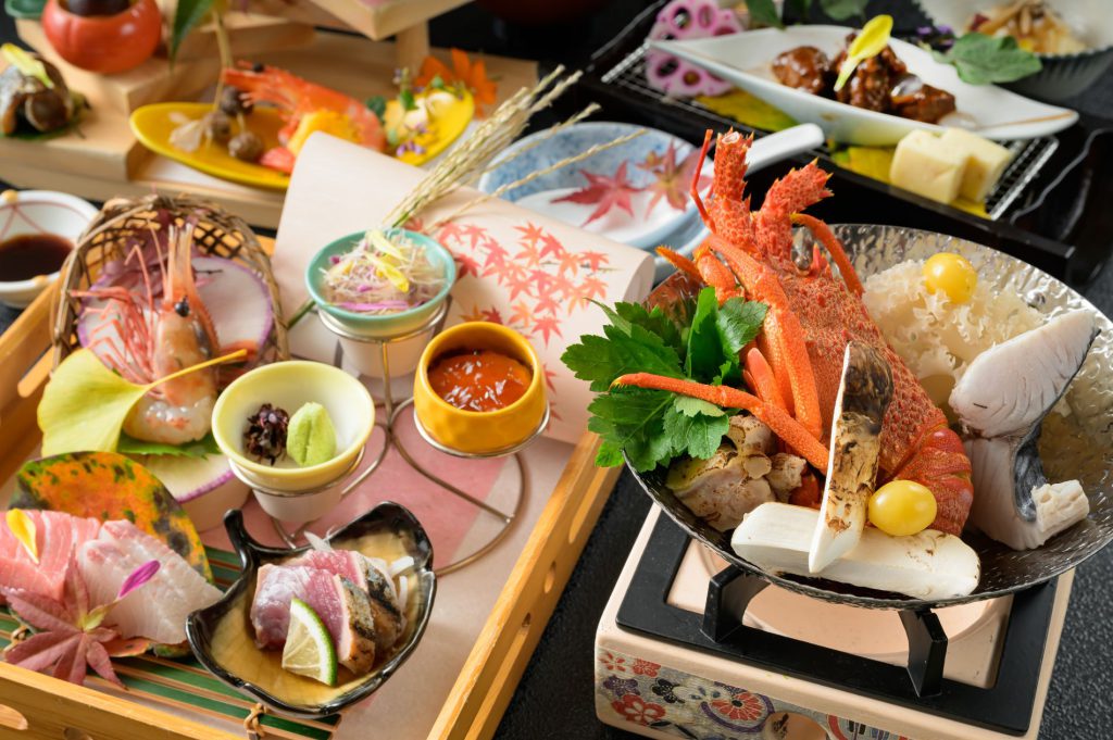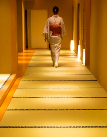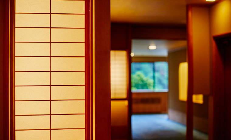 全室山側眺望、四季折々の景色に包まれる上質な和の空間「万葉館」。お食事は一品一品こだわり作り上げる創作和会席を個室のお食事処でごゆっくりとお楽しみ頂けます。