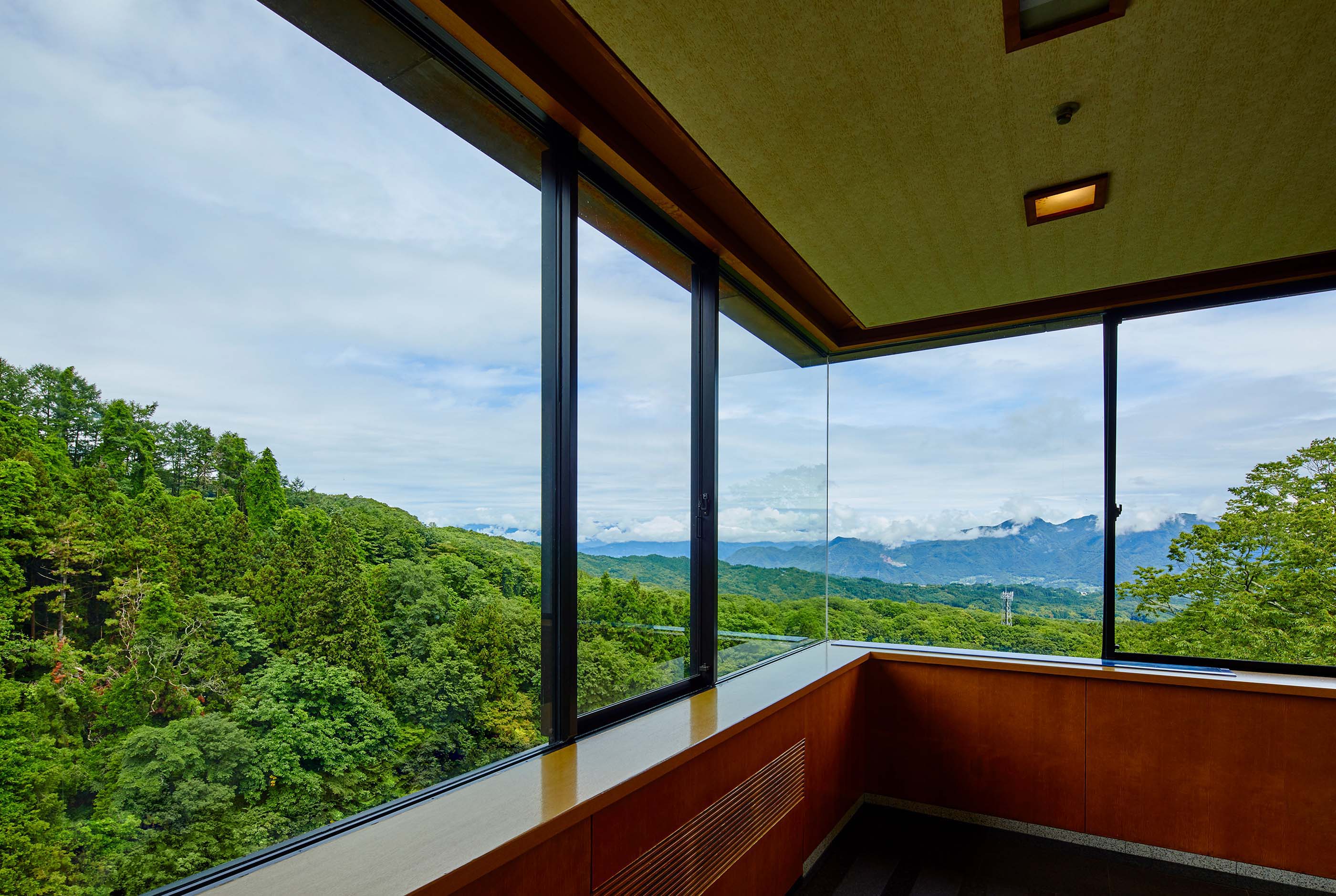 石段街最上段に位置する当宿の石段街側入り口に最も近い千樹館。ご散策にも便利、山側の高層階からは遠く山並みを見晴らす絶景が広がります。離れの「ことほぎ」は全室ゆったりとした洋室フロア。気軽に伊香保旅をお楽しみ頂けるスタンダードフロアです。