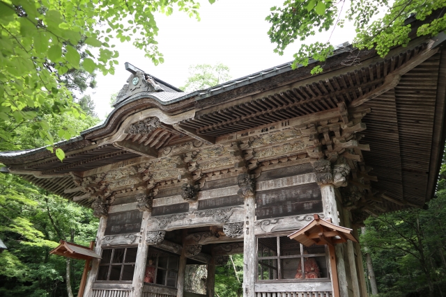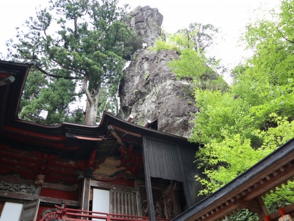文化3(1806)年に建てられた本殿は、国の重要文化財に指定されています。本殿は背後の「御姿岩(みすがたいわ)」とつながっていて、その岩の洞窟内にご神体が祀られているといいます。 前から見るとふつうの神社の本殿に見えますが、右手から裏を見てみてようやくこの本殿の特異さがわかります。