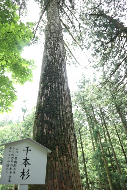 もし、補強がされていなかったら、歩くだけでも修行になりそうな道ですよね。 その先から道は狭くなり、急な登りになっていきます。左には、「矢立杉(やたてすぎ)」という杉の巨木が現れます。