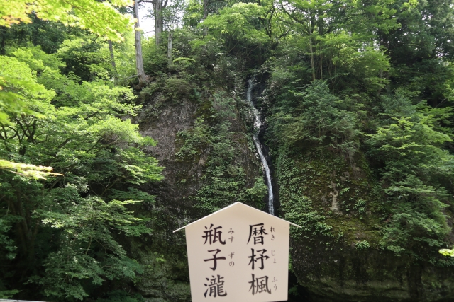 武田信玄が戦勝祈願のために矢を射立てたという言い伝えがあります。 その右手には、「瓶子(みすず)の滝」。