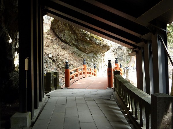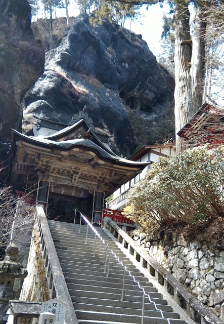 滝の流れている両脇の岩を神に捧げる神酒を入れる器の瓶子(みすず)に見立てて、そこから落ちる滝ということで、この名が付いたとか。流れは細く、白ヘビが天に昇っていくようにも見えます。 滝を過ぎると階段となり、その先に大岩を背後にしたがえた力強い門が構えます。