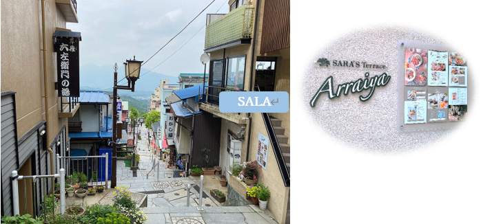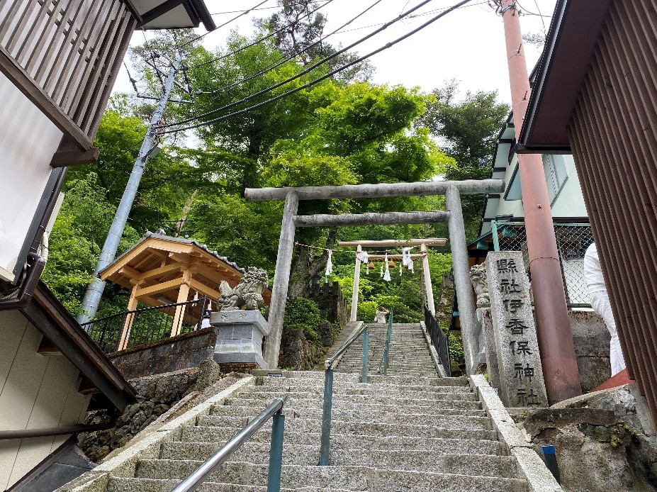 坂を少し降りると、石段街全体がこのように一望できる写真映えスポットが。右手にあるのが当宿から近く、スイーツやランチなども人気のカフェレストラン「SARA」 福一は365段ある石段街でも上部に位置しており、少し上るとすぐ最上部の「伊香保神社」へ行くことができます。100Mほどすすむと道すがら「温泉饅頭の発祥の地」勝月堂さん、その奥には医王寺薬師堂もあり、ゆっくりご散策にはうってつけです。 【伊香保神社】
