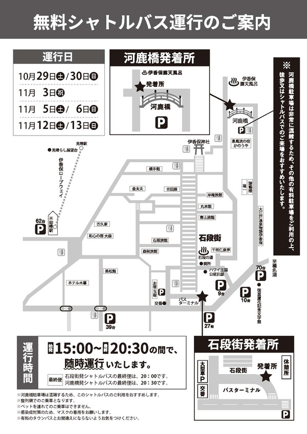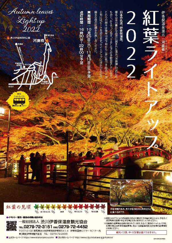 ■伊香保温泉湯物『河鹿橋』紅葉ライトアップ■ 実施期間:10月25日(火)~11月13日(日)予定 点灯時間:16時30分~22時00分予定 無料シャトルバスも運行していますが、当宿にチェックイン後でしたら、断然歩いて行かれるのをお勧めいたします。 徒歩約8分ほどです。 夜はずいぶん冷え込んできましたので、上着を忘れずにお持ちくださいませ。