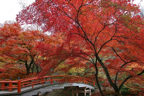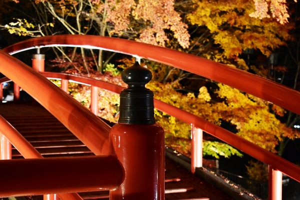 さて、10月25日より、河鹿橋の紅葉ライトアップがスタートしています。 例年11月上旬に紅葉の色づきがピークを迎える河鹿橋。 昼間は、太陽に透けた真っ赤な紅葉、夜にはライトアップされた真っ赤な紅葉と昼も夜も訪れる人々の目を愉しませてくれます。