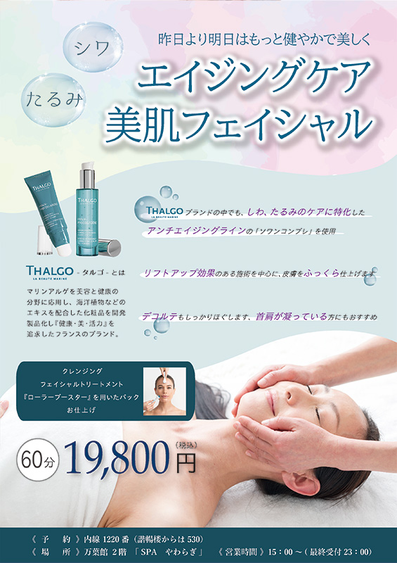 伊香保温泉では当宿だけの限定メニュー「タルゴトリートメント」。タルゴはギリシャ語のタラッサ〈海〉とフランス語のアルゴ〈藻〉に由来する言葉。「タラソテラピー」は生命の根源といわれる海の恵みを体内に取り込むことによって身体の自然なバランスを取り戻すことを目的とした自然療法です。