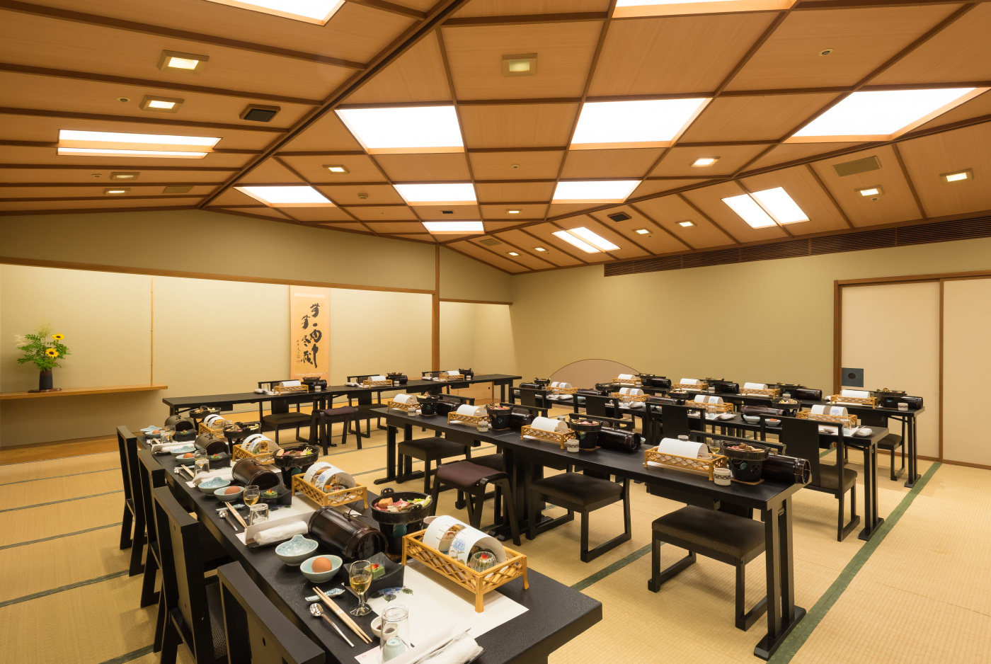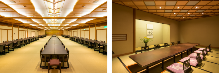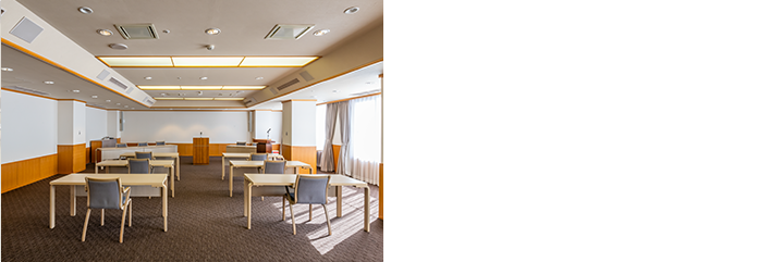 数名様から30名様まで広さの異なる空間ではスクール式、ディスカッション式、またじっくりと討議できる掘りごたつコの字型など、レイアウトも自在に対応。