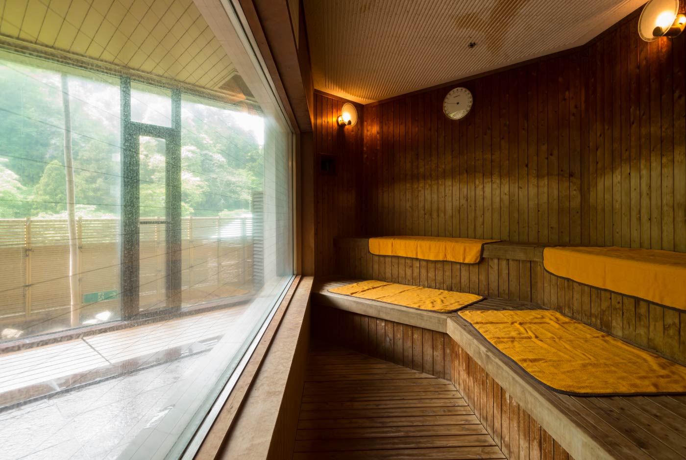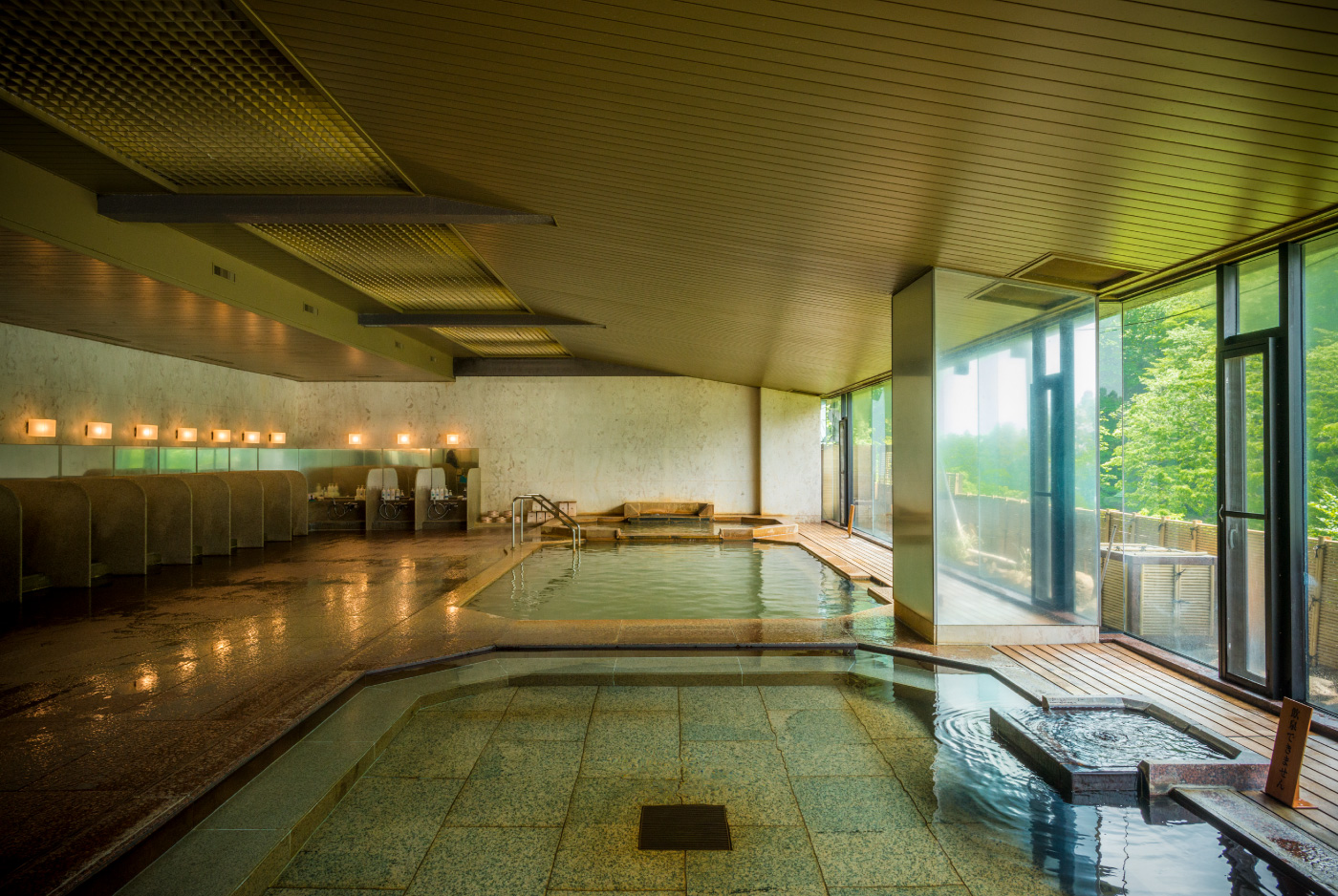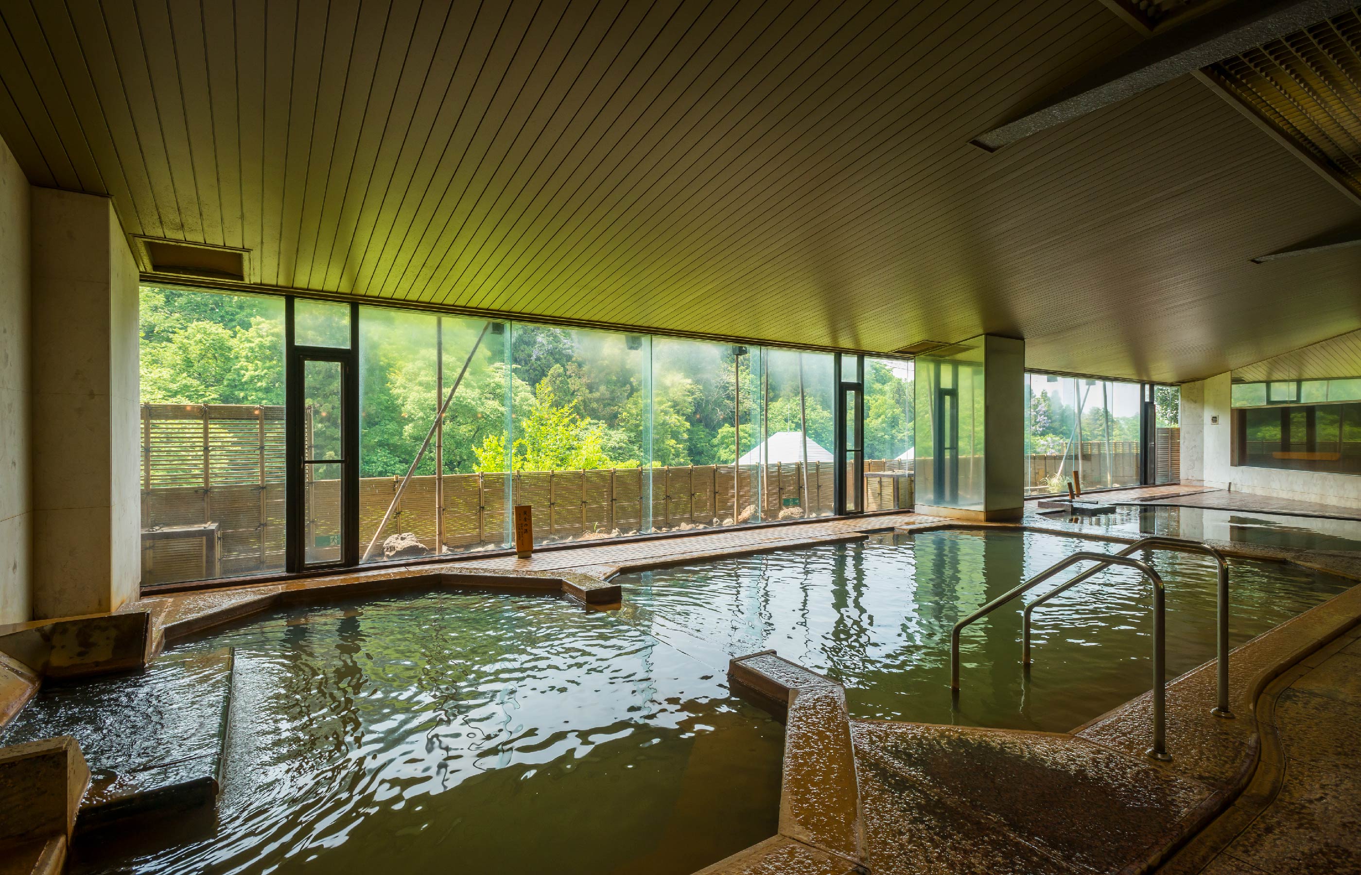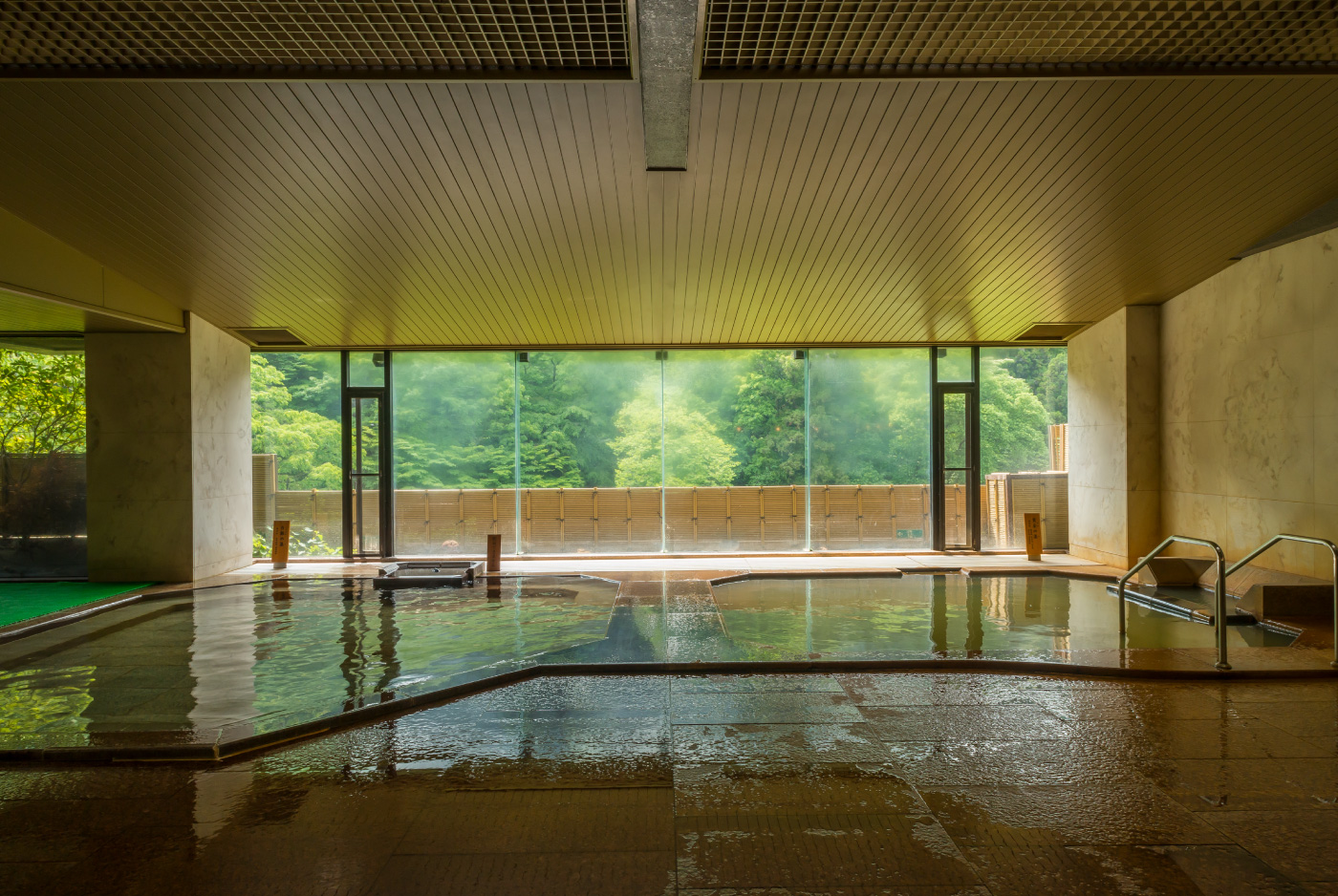 ガラス張りの大浴場は木々の緑が美しく映え、