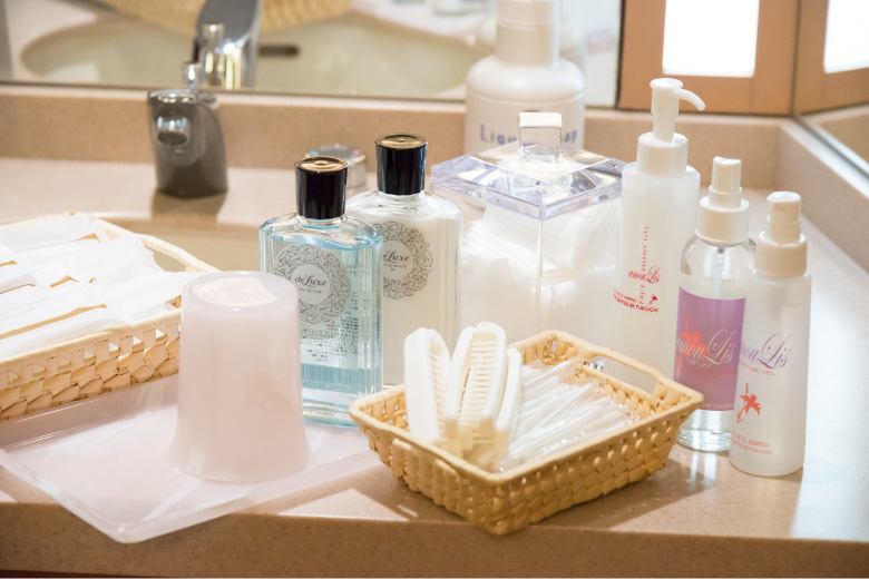 大浴場には、ハンドタオル、バスタオルとも備え付けており、 備え付けのほか選べる十数種類のシャンプーバーサービスもございます。湯上りのアメニティ(化粧水など)も無料にてご用意しております。
