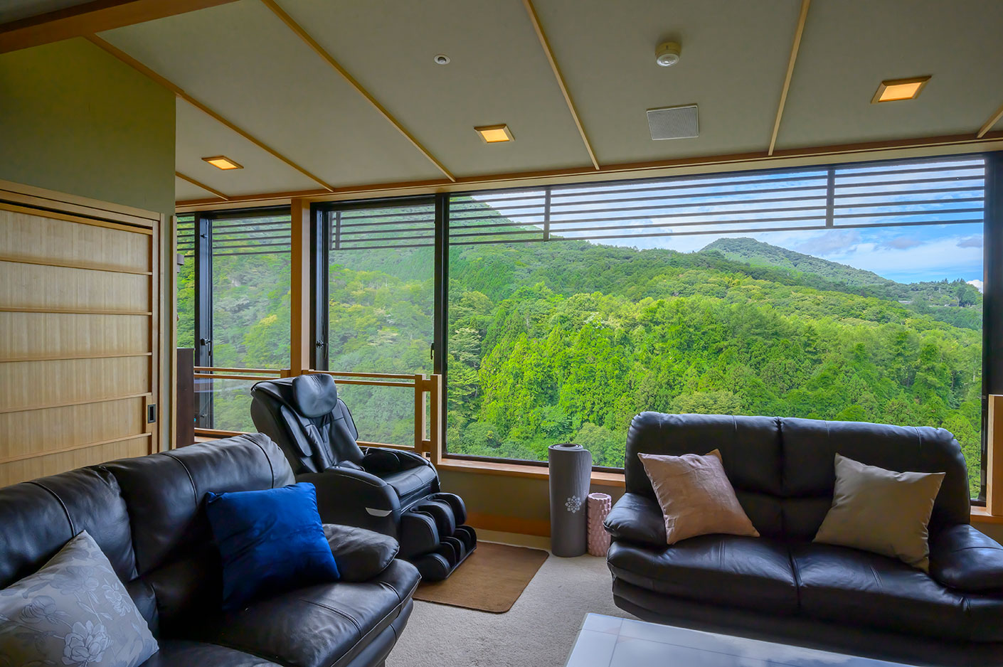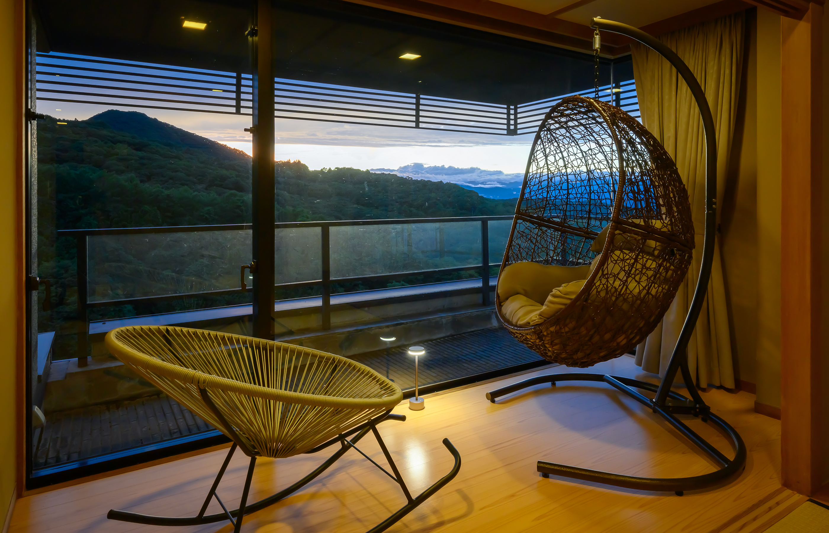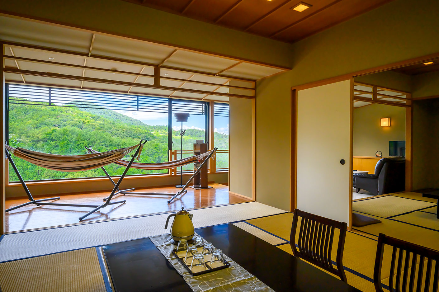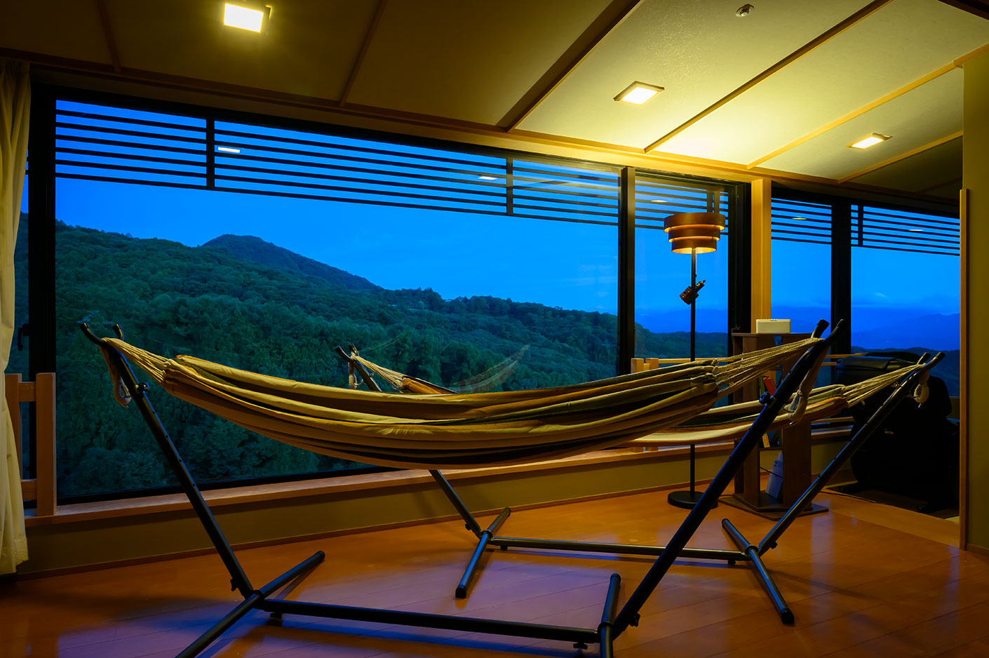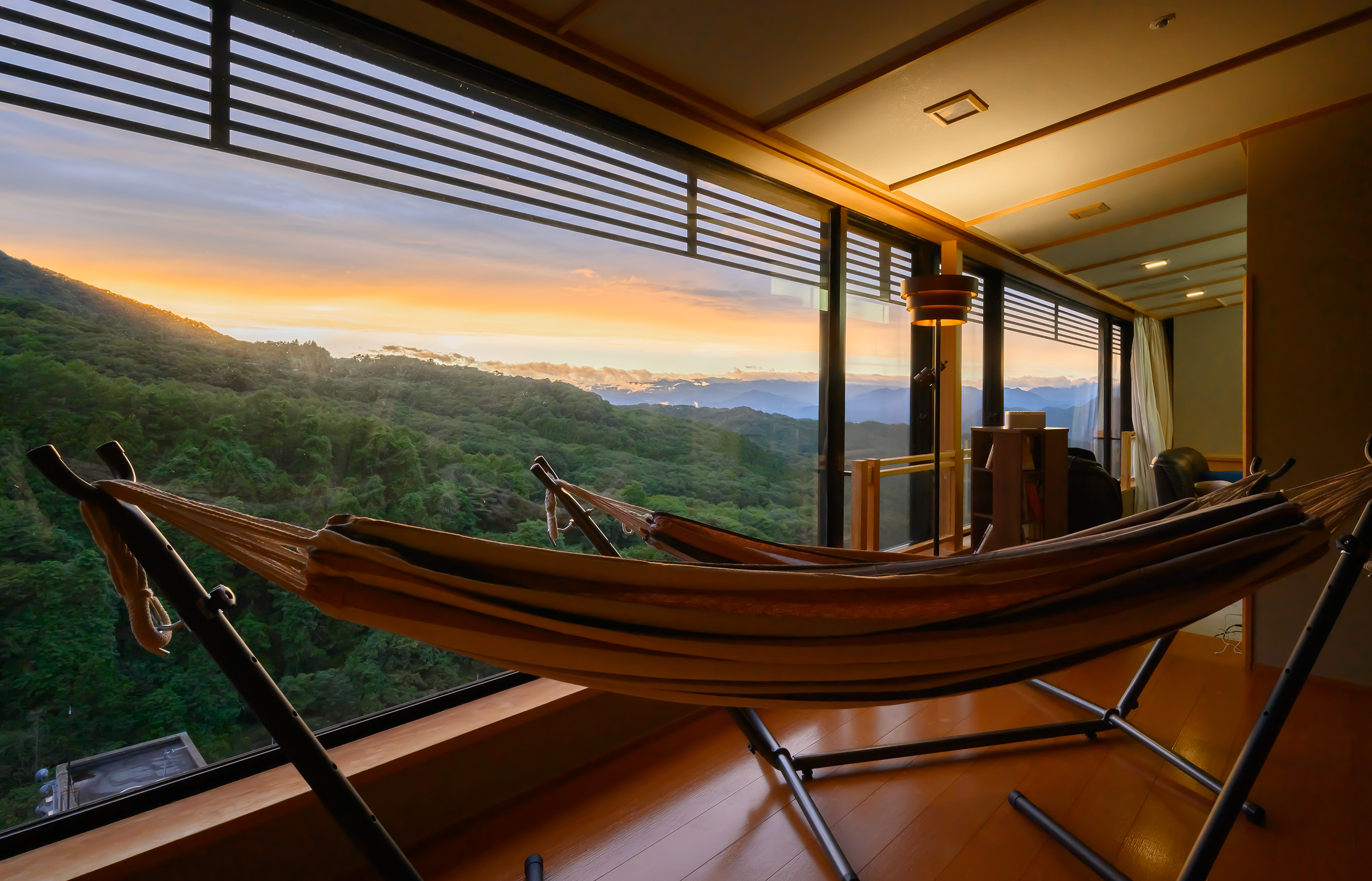マッサージチェアや本棚を備え、日本画のように美しく連なる山並みを眺めながら静かなリラクゼーションを楽しむ落ち着いた大人のお部屋。窓際には寛いで景色を眺められるハンモックやソファ。上質な寛ぎ時間をお過ごしいただける空間です。