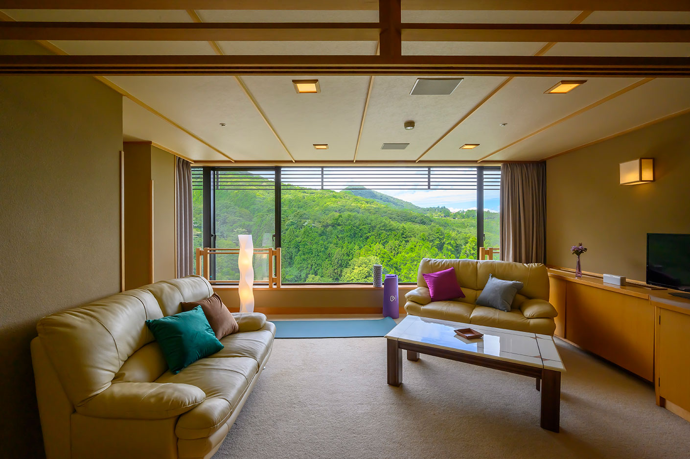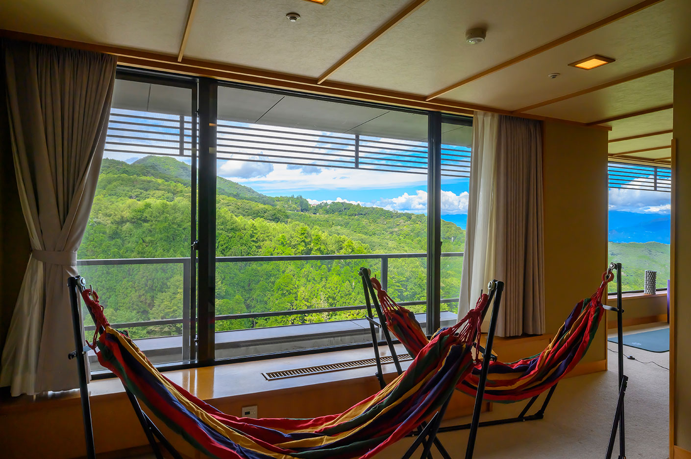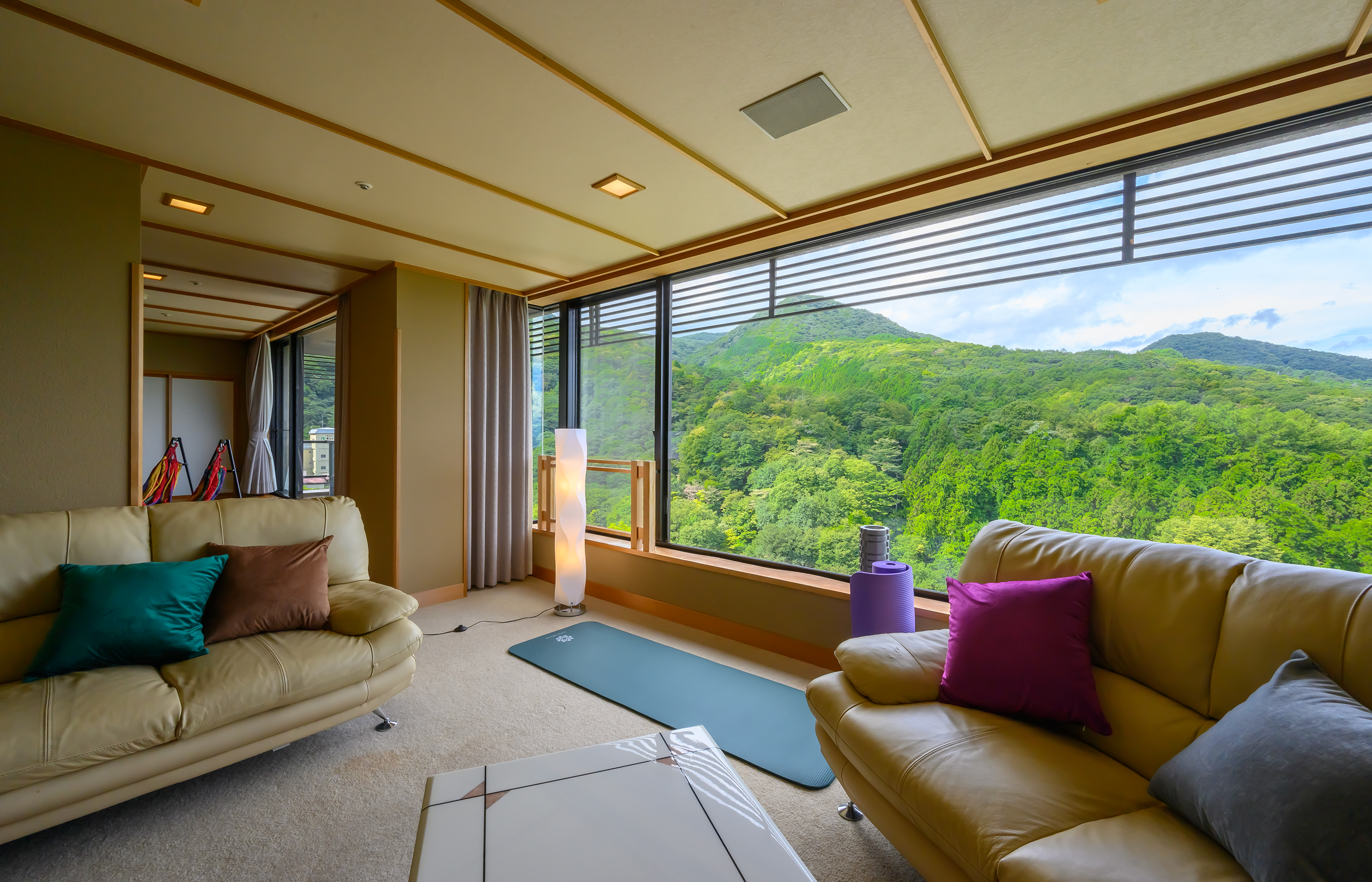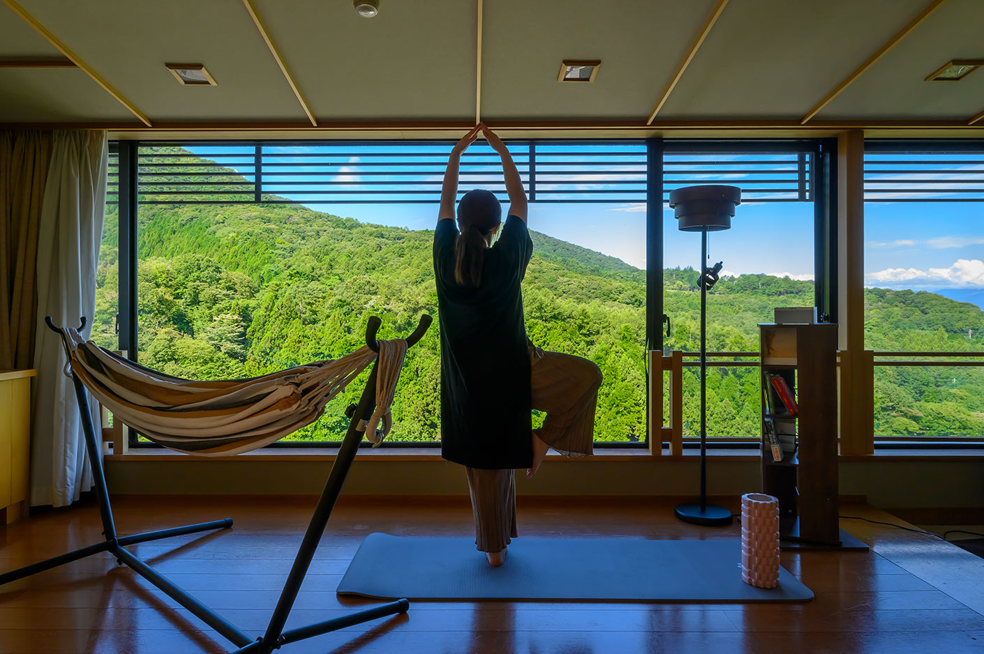 伊香保一空に近い最上階26階。山々の景色に包まれて行う天空ヨガ。ヨガマットやフォームローラーを備え、ウェルネスな旅をお楽しみいただけます。心身ともにリフレッシュできる、心が躍るようなお部屋です。