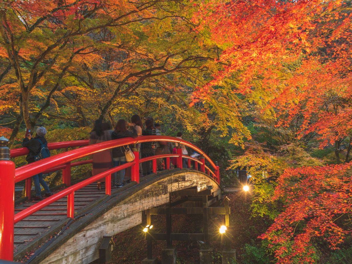 <河鹿橋ライトアップ情報> ●日程:2023年10月24日(火)~2023年11月12日(日) ●点灯時間:16:30~22:00 ●福一からのアクセス: =徒歩:約9分 =お車:約2分(駐車場有)