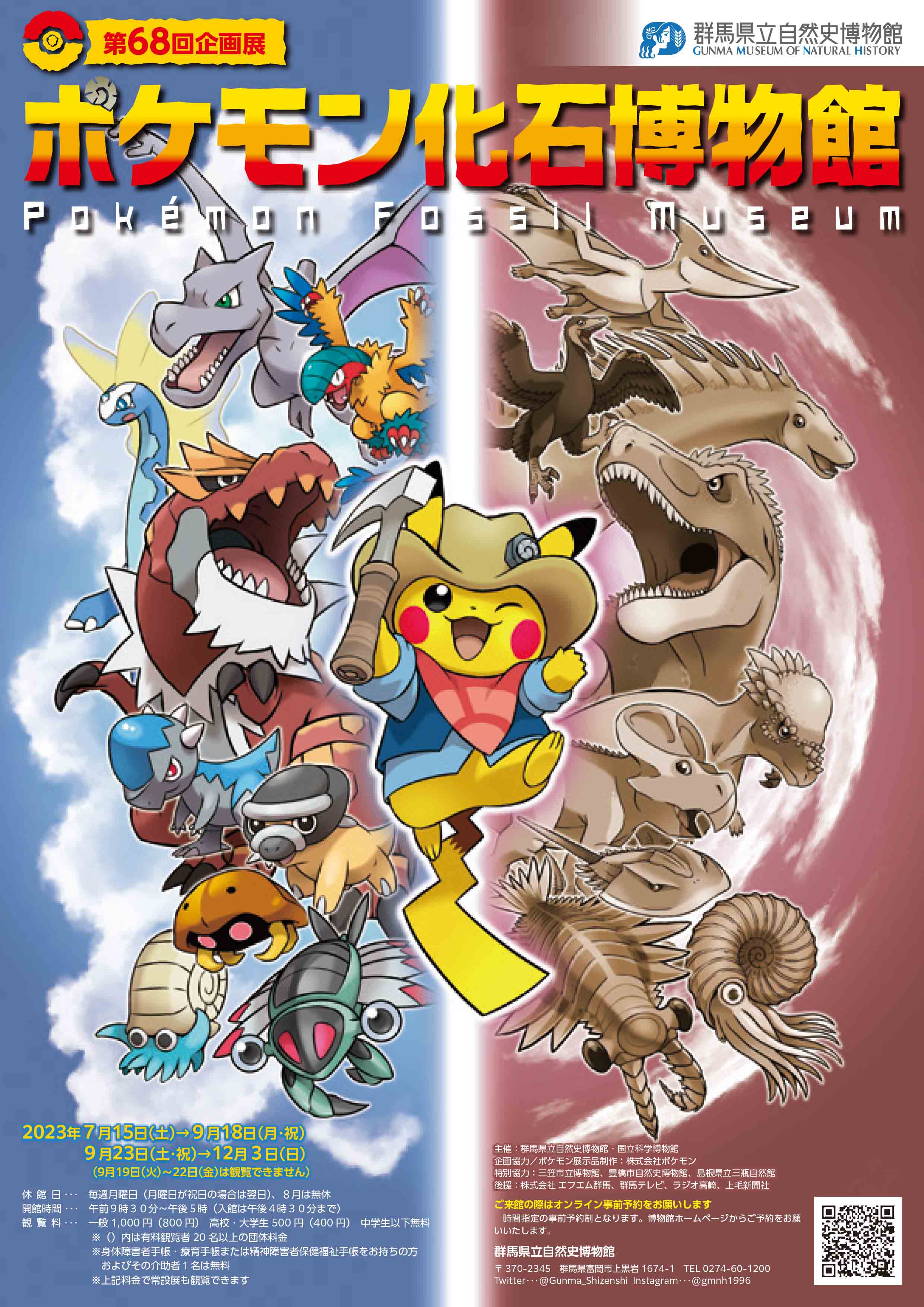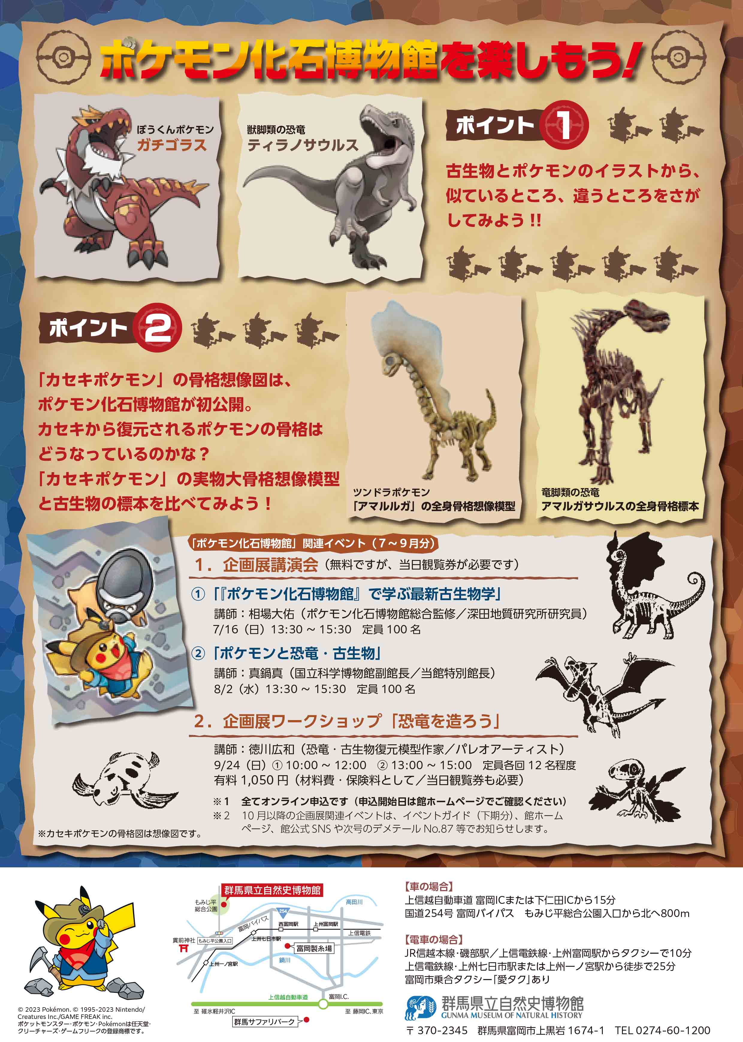 あの人気の企画展が、ついに群馬県にやってきた! 講演会やワークショップをはじめ、期間限定の特設ショップも開設されます! ポケモンたちと一緒に古生物学について楽しく学びましょう! 【期間】2023年7月15日(土)~2023年12月3日(日) [9月19日(火)~22日(金)は観覧できません] 【時間】9:30~17:00(最終入館16:30) ※毎週月曜日休館 【場所】群馬県立自然史博物館 (群馬県富岡市上黒岩1674-1) 【参加費】大人1,000円 高大生500円 中学生以下無料 【申し込み】博物館ホームページの予約サイトより(30日前より予約可) ▼公式HP▼ http://www.gmnh.pref.gunma.jp/event/14757 \関連イベント/ ■企画展ワークショップ「恐竜を造ろう」 講師:徳川広和(恐竜・古生物復元模型作家/パレオアーティスト) 9/24(日)①10:00~12:00 ②13:00~15:00 定員各回12名程度 有料1,050円(材料費・保険料として/当日観覧券も必要) ▼企画展詳細はこちら▼ https://www.kahaku.go.jp/pokemon/