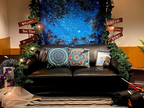イルミネーションが灯るタープテント内では、ソファやビーズクッションなどお好みの場所で おしゃべり&カフェ気分。