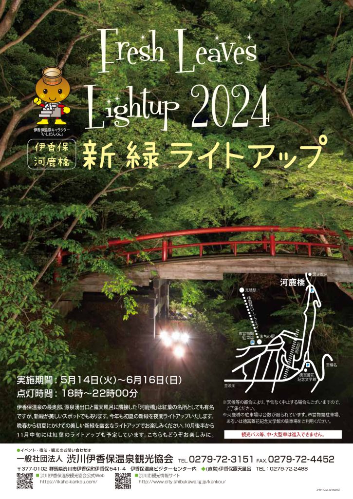 新緑と河鹿橋のコントラストを幽玄なライトアップでお楽しみください。