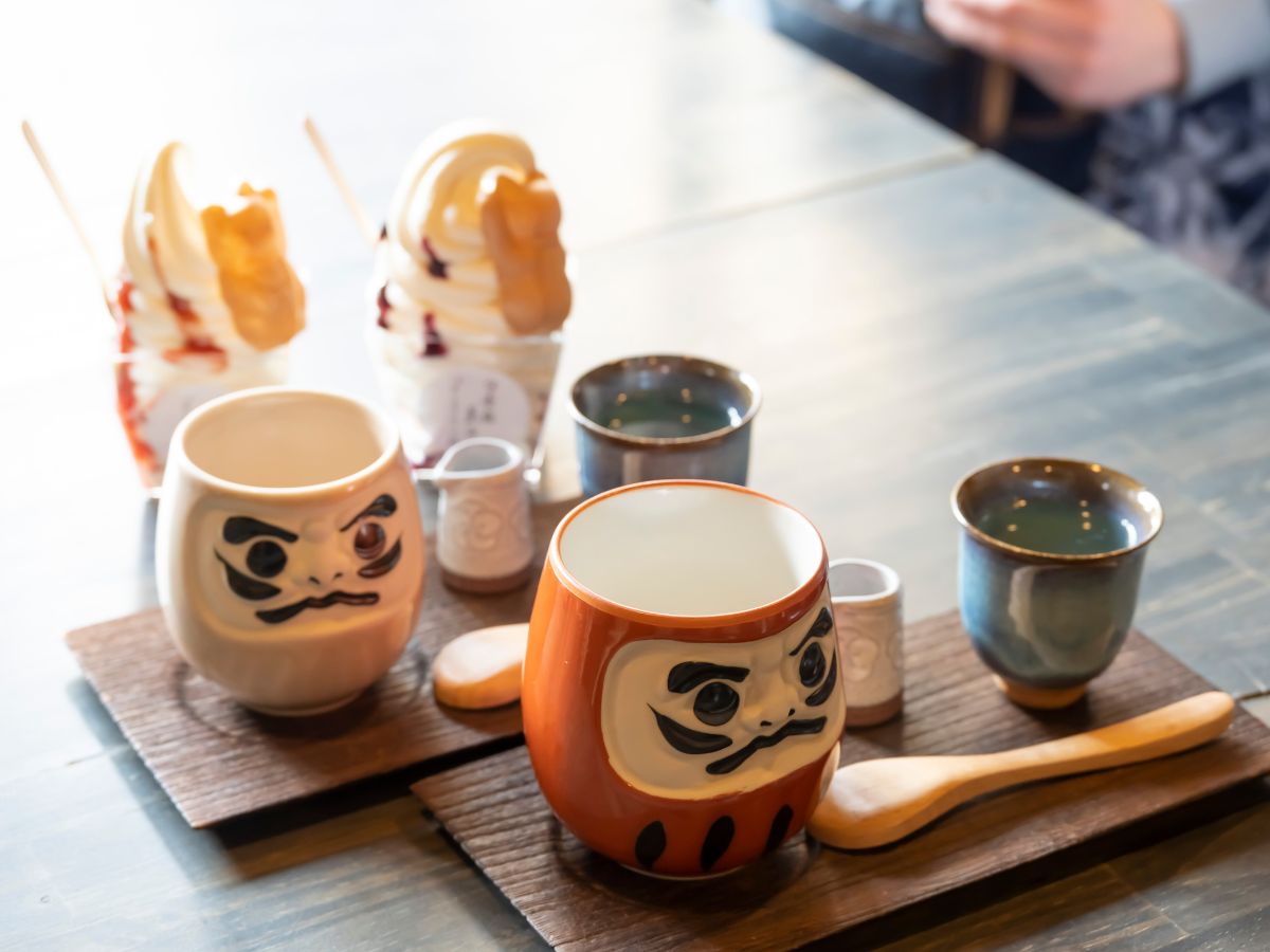 だるまの器が可愛い「だるまミルクプリン(ほうじ茶ソース・ドリンク付き)」が人気です。