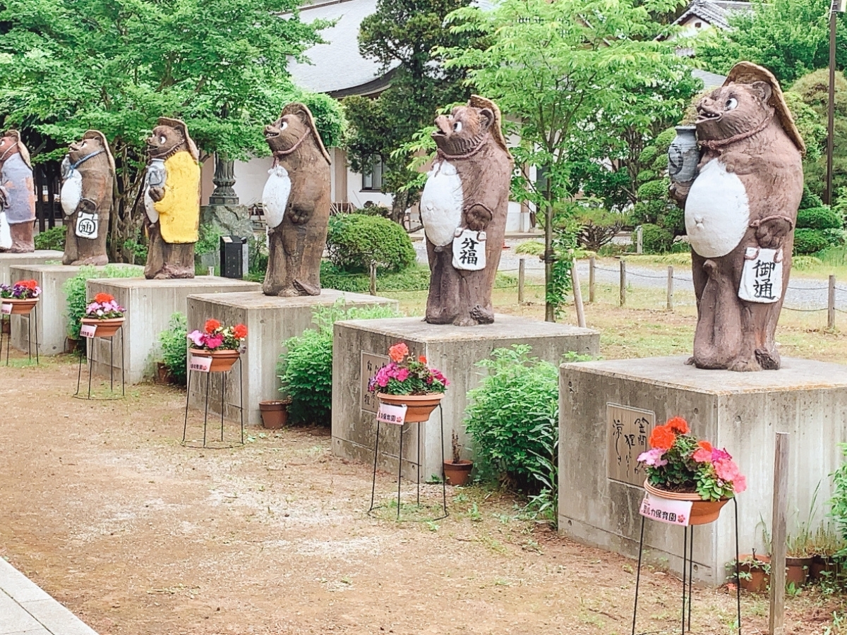 かわいらしい狸たちを眺めながら境内を歩くことができます。