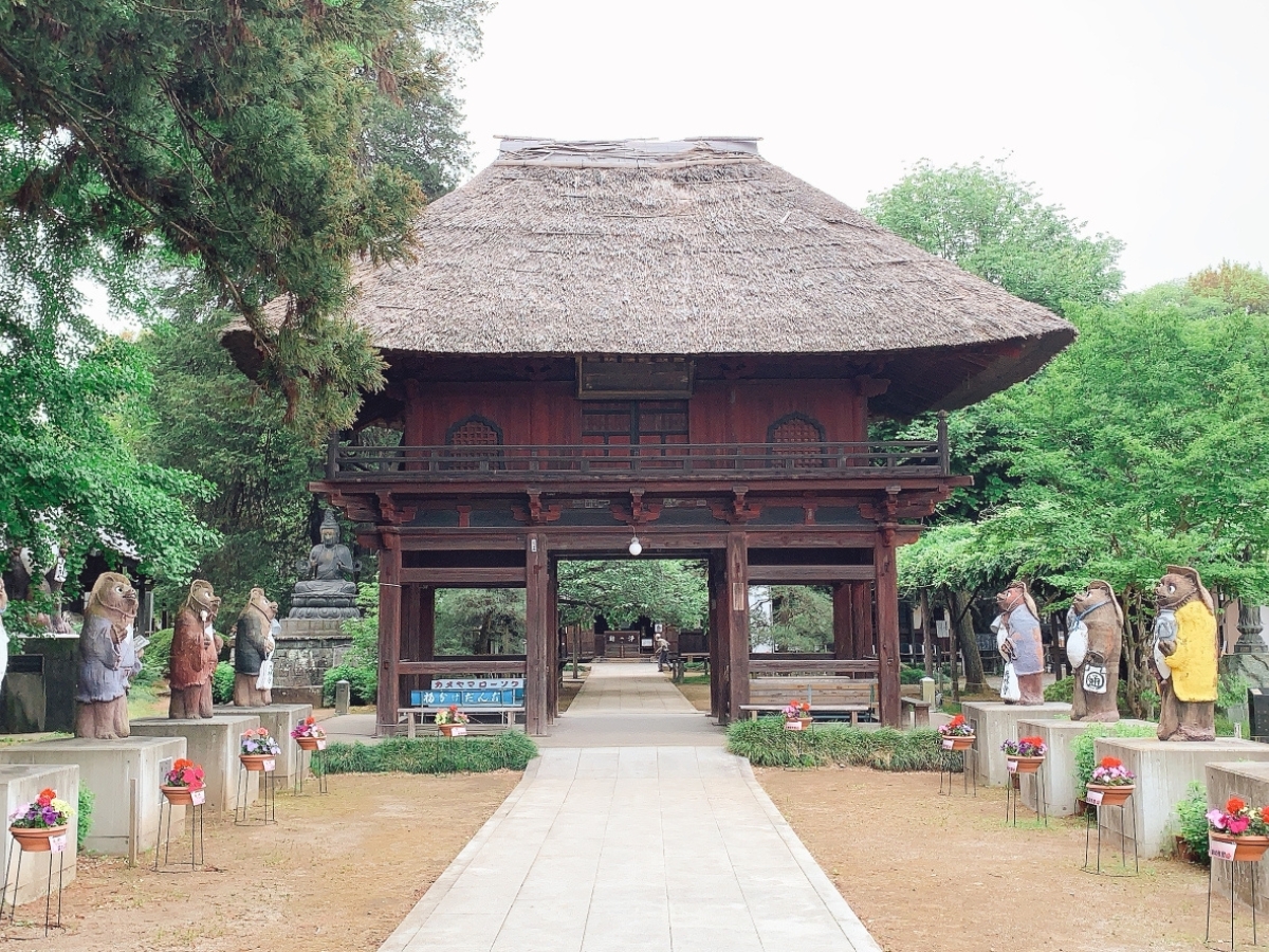 分福茶釜の寺として知られる茂林寺の境内には、21体の狸像が。
